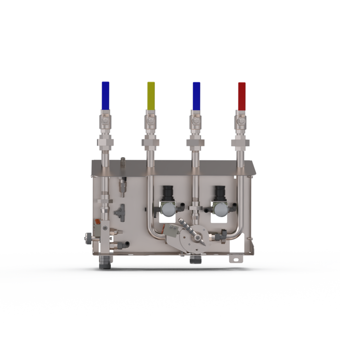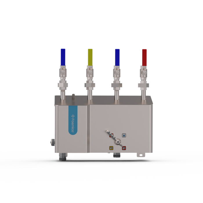 PSU 0127-PB2-FF_LB-F satellite for pre-dilluted chemicals (PDC) is to be connected with FOAMICO mixing stations B-D 40-10F, B-D 80-10F or B-D 120-10F and a Foamico booster. This will provide the satellite with PDC and pressurized water. PSU 0127 satellite for PDC are available in 9 standard versions. The system is capable of handling 3 chemicals in a single block with only one outlet!