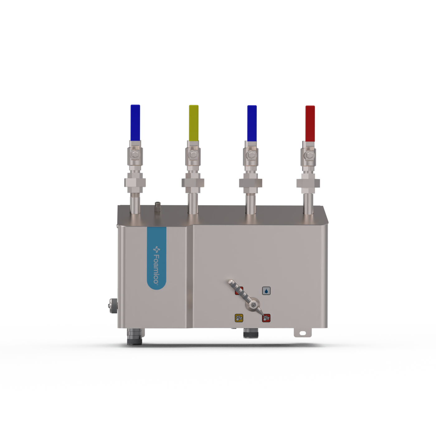 PSU 0127-PB2-FF_LB-F satellite for pre-dilluted chemicals (PDC) is to be connected with FOAMICO mixing stations B-D 40-10F, B-D 80-10F or B-D 120-10F and a Foamico booster. This will provide the satellite with PDC and pressurized water. PSU 0127 satellite for PDC are available in 9 standard versions. The system is capable of handling 3 chemicals in a single block with only one outlet!